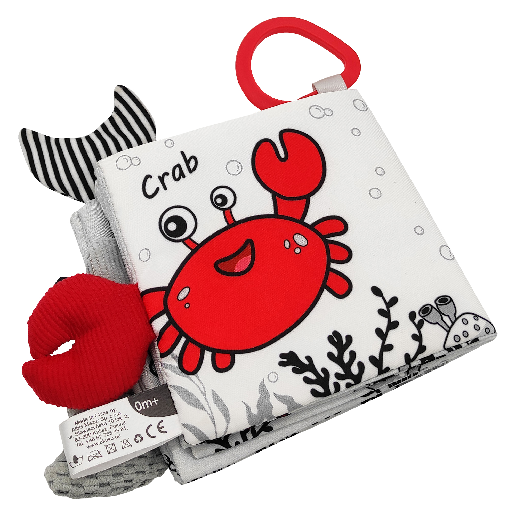 Kontrastinen aistikirja merieläimet on loistava lelu pienimmille lapsille, jotka vasta opettelevat tutkimaan maailmaa. Se on täynnä yllätyksiä, jotka pitävät pienen lapsen kiinnostuneena. Kosketusaistin stimulointi edistää vauvan tasapainoista kehitystä. Kirja on varustettu useilla eri pintatekstuureilla, ulokkeilla ja toiminnallisilla ominaisuuksilla kuten vinkuvat, rapisevat ja helisevät elementit. Lelu tukee vauvan kehitystä ensimmäisistä päivistä lähtien ja stimuloi näkökykyä. Lelussa on käytetty värejä, jotka vauva näkee jo syntymästä lähtien. Se stimuloi vauvan visuaalisen, auditiivisen ja motorisen koordinaation kehittymistä. Se sopii erinomaisesti tarttumisen oppimiseen ja mielenkiintoisten äänien ja muotojen löytämiseen. Lelu voidaan kiinnittää lastenvaunuihin tai pinnasänkyyn käytännöllisen kiinnitysklipsin avulla. Koko: 12 × 12 cm.