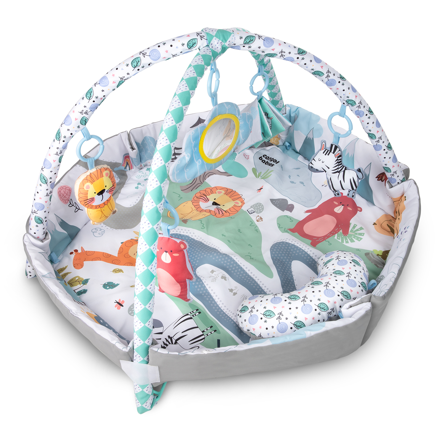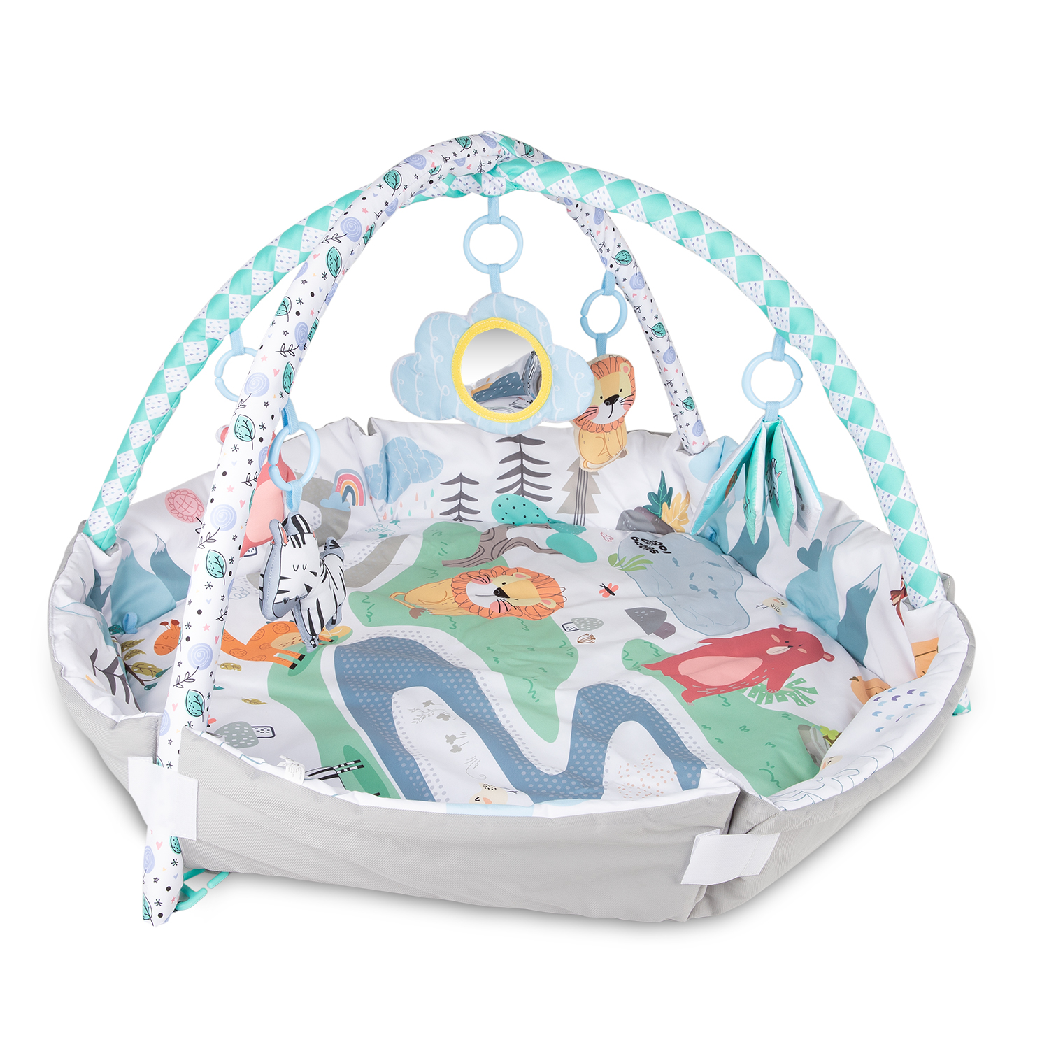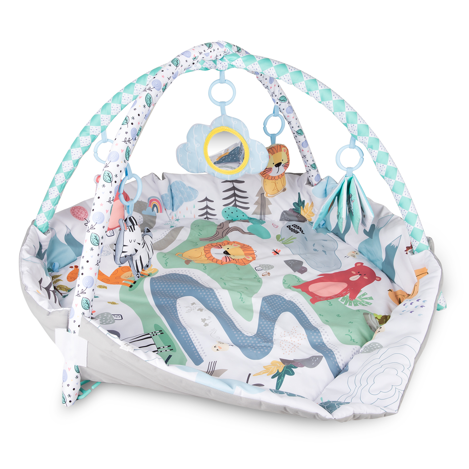 Kaarissa roikkuvat hahmot seepra, leijona ja karhu sekä kirja ja peili kannustavat lasta aktiivisuuteen ja kurottautumiseen, edesauttavat motoristen taitojen oppimista, vahvistavat lihaksia sekä tukevat näkö-, kuulo- ja tuntoaistin kehittymistä leikin avulla. Materiaalien erilaiset tekstuurit, kontrastivärit ja pehmeät äänet ovat loistavaa viihdettä vauvan kehittyville aisteille elämän ensimmäisistä hetkistä lähtien.