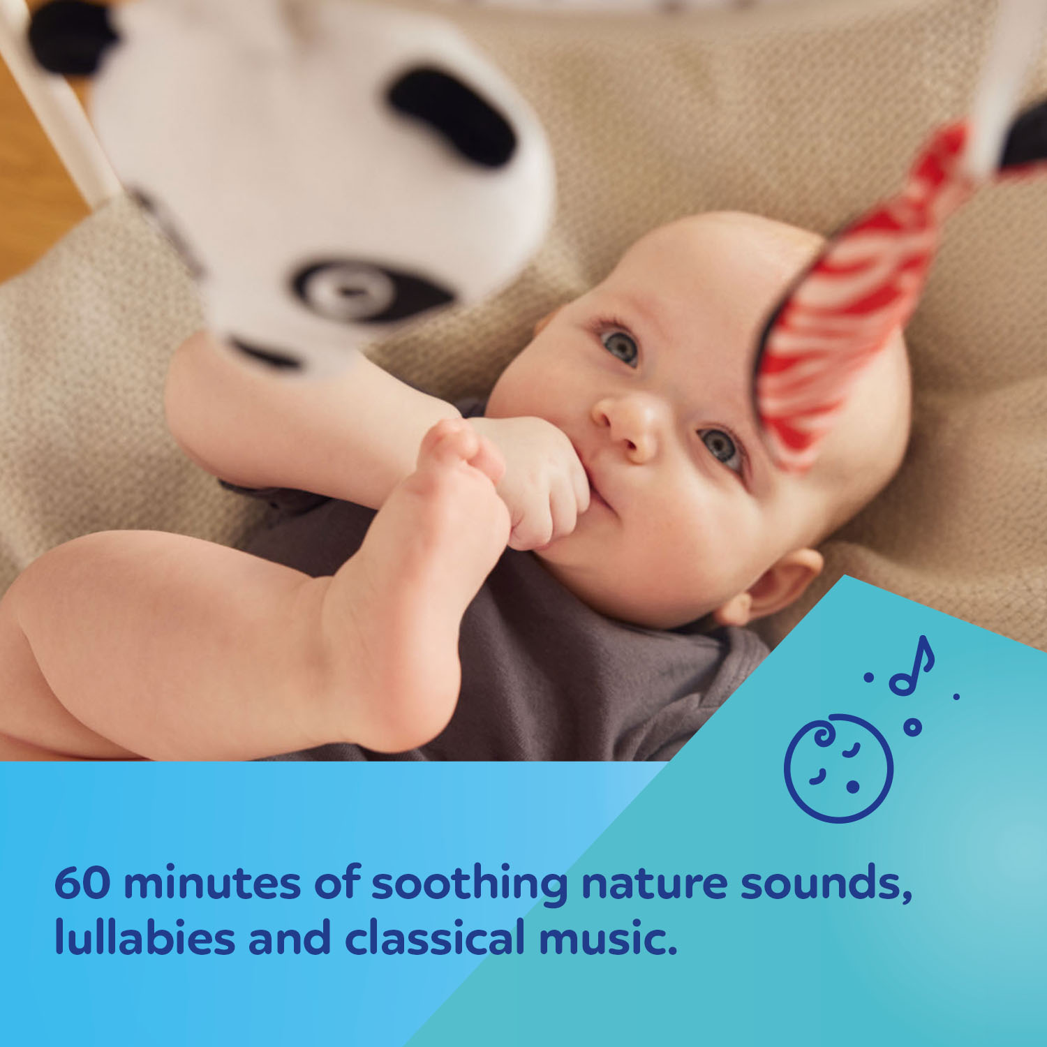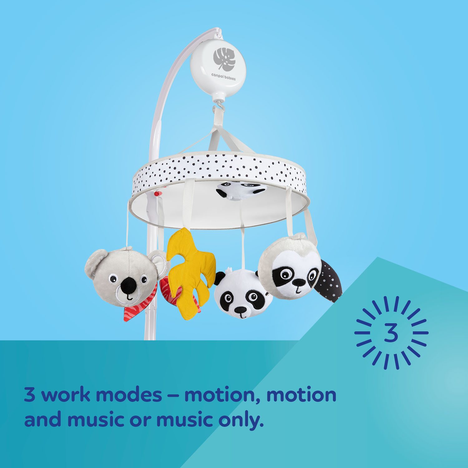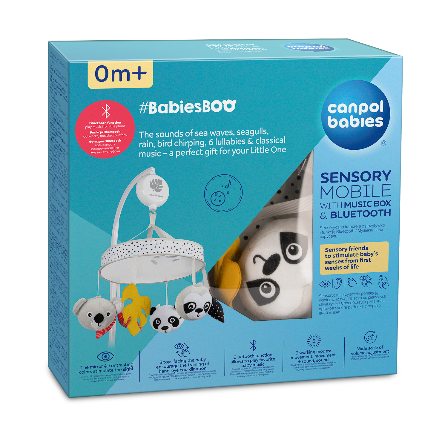 Ainutlaatuinen ja moderni vauvansängyn aistimobile saa vauvan huomion pitkäksi aikaa ja luo viihtyisän ja rauhallisen ilmapiirin nukkumiseen. Soittorasia soittaa 60 minuuttia yhtäjaksoista melodiaa, ja tämän ajan jälkeen se sammuu automaattisesti - 11 melodiaa: valkoista kohinaa, meren aaltojen ja lentävien lokkien ääniä, sadetta, metsän kohinaa ja lintujen laulua, 6 kehtolaulua ja klassista Mozart-musiikkia. Bluetooth-toiminnolla varustettu laite mahdollistaa suosikkimelodioiden ja -satujen kytkemisen päälle matkapuhelimen sovelluksesta. Mobilessa on 3 toimintatilaa: liike, liike & musiikki tai pelkkä musiikki. Soittorasiassa on laaja äänenvoimakkuuden säätöalue - voit helposti säätää sen vauvasi mieltymysten mukaan. Canpol babies -aistimobilessa on erityisesti profiloitu kiinnitysrakenne, jonka ansiosta se voidaan kiinnittää helposti ja vakaasti vauvansängyn runkoon. Mobilessa on 6 erilaista lelua, joista 3 söpöä eläintä katselee vauvaa. Kontrastivärit - valkoinen ja musta yhdistettynä keltaiseen ja punaiseen väriin houkuttelevat lapsen huomiota ja kiehtovat mielikuvitusta. Koko alaosa on peilipintaa, josta lapsi näkee kasvonsa, mikä herättää hänen uteliaisuutensa. Mobiileen asennetut riipukset ja suuri peili kannustavat lasta ojentamaan kätensä niitä kohti, mikä tukee lihasten kehittymistä ja harjoittaa näköaistia sekä silmä-käsi-koordinaatiota. BabiesBoo aistimobile soittorasialla ja Bluetoothilla on täydellinen lahjaidea vastasyntyneelle tai vauvakutsuille.