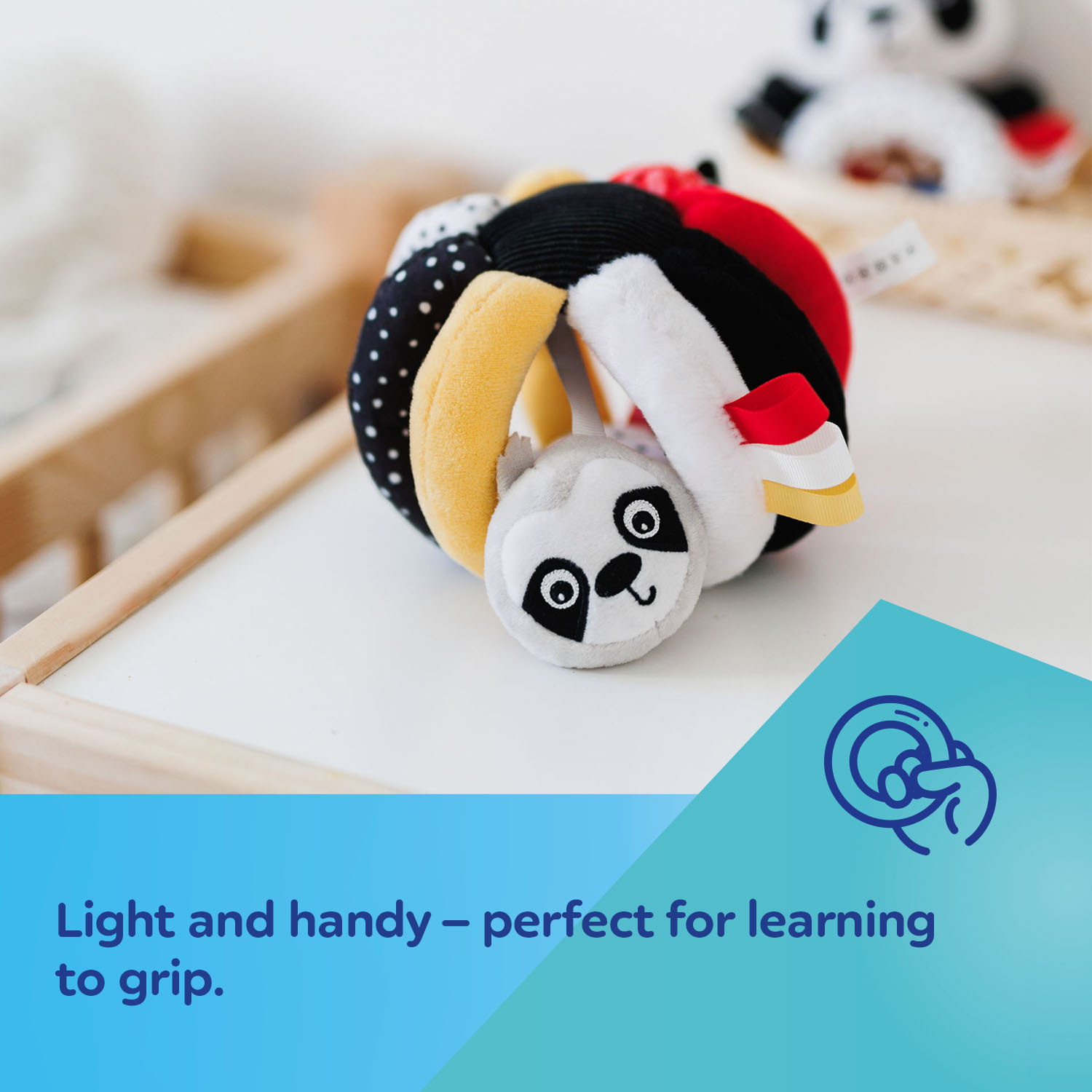 Pehmeä pallo antaa lapselle mahdollisuuden tutustua moniin aistittaviin ominaisuuksiin - rapinaan, vinkuviin elementteihin, värikkäisiin nauhoihin ja erilaisiin tekstuureihin. Aistipallo sopii erinomaisesti pyörittämimiseen, kiinniottamiseen ja heittelyyn, mikä kehittää sorminäppäryyttä ja koordinaatiota. Pallossa on helistin, joka ääntelee pehmeästi leikkiessä ja rohkaisee vauvaa ryömimään. Pehmeä aistipallo on kevyt ja miellyttävä tarttua, se sopii pienen lapsen käsiin, ja se on täydellinen puristamiseen, taivuttamiseen ja puremiseen. Nauhassa olevan laiskiaisen kasvot näyttävät toisella puolella silmät auki ja toisella puolella nukkuvat kasvot, mikä auttaa erojen huomaamisessa. Puristettaessa lelu antaa mielenkiintoisen äänen. Nauhojen ja lelun rakenteen ansiosta siitä voi helposti tarttua kiinni tai sen voi kiinnittää. Tämä lelu sopii erinomaisesti aistileikkeihin, se tukee kuuloaistin ja liikkeen motorisen koordinaation kehittymistä sekä visuaalisia havaintoharjoituksia.