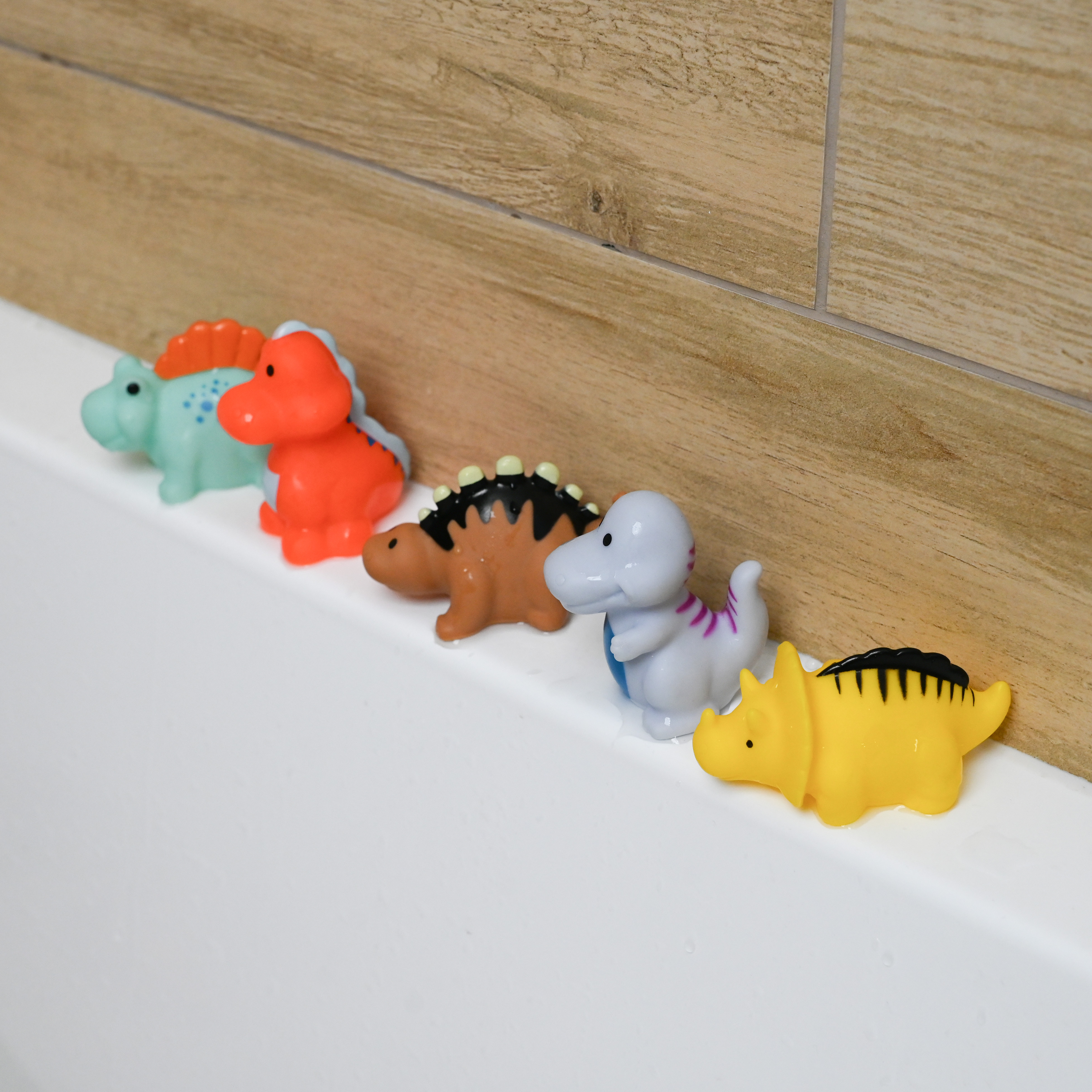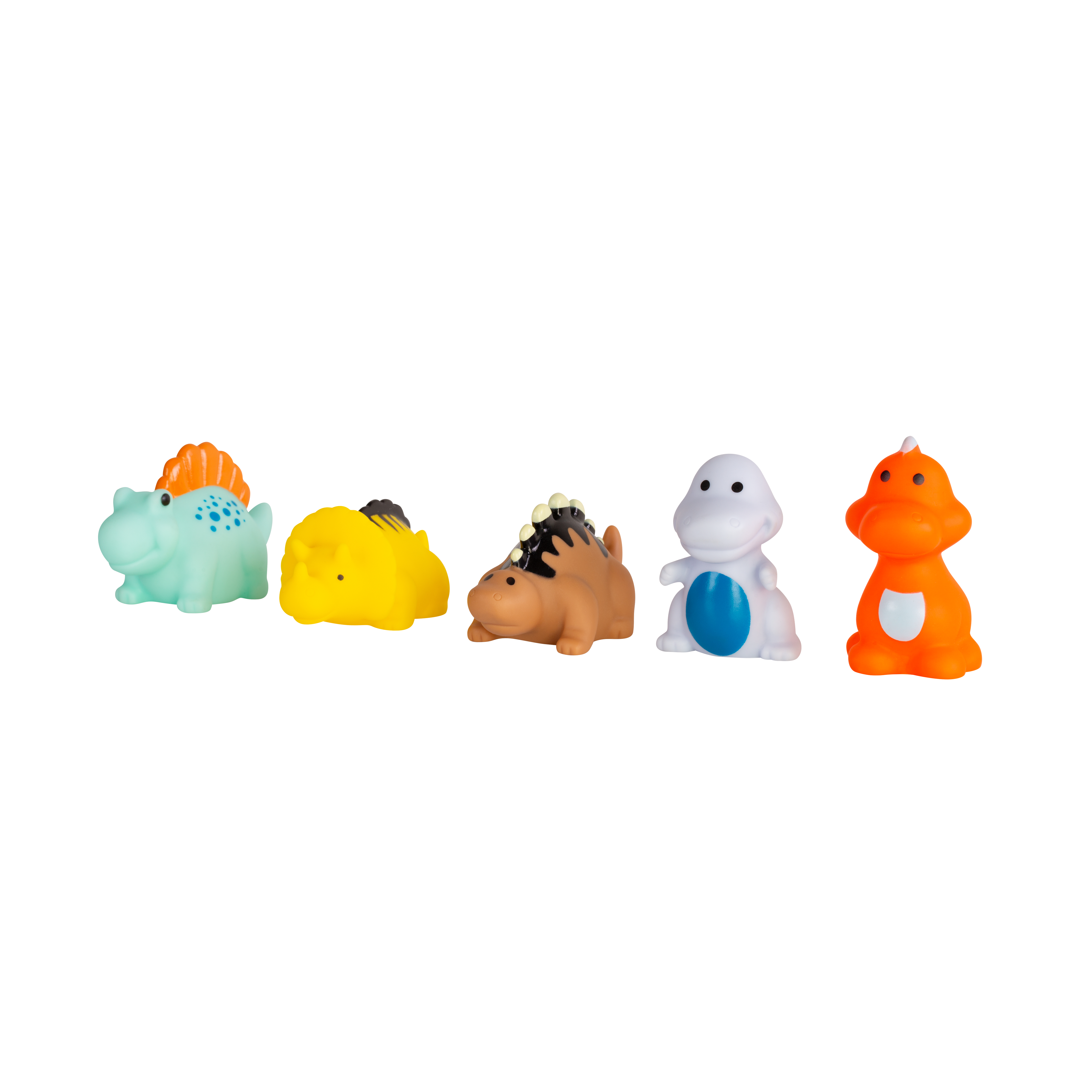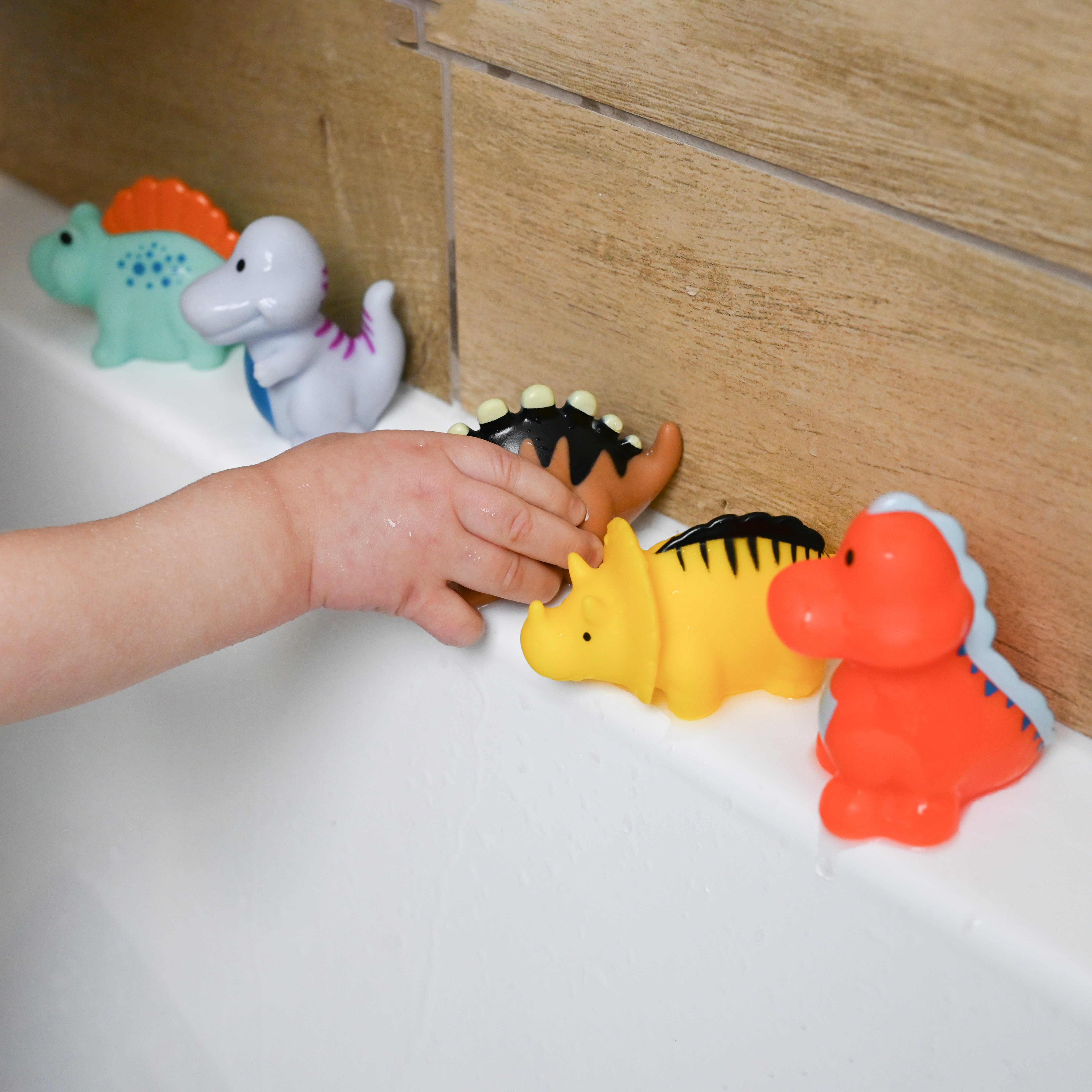Värikäs kylpylelusetti iloisiin kylpyleikkeihin. Kauniit värit houkuttelevat lasten huomion. Leikin kautta lapsi tutustuu ympäröivään maailmaan. Setissä on 5 erilaista dinosaurusta. Hahmoissa ei ole reikää, joten ne on helppo pitää puhtaina ja hygieenisinä. Pyöristetyt muodot takaavat turvallisuuden leikkiessä. Valmistettu turvallisista, korkealaatuisista materiaaleista, ne eivät sisällä bisfenoli A:ta (0 % BPA). Eläinhahmojen koko on 4-7 cm.