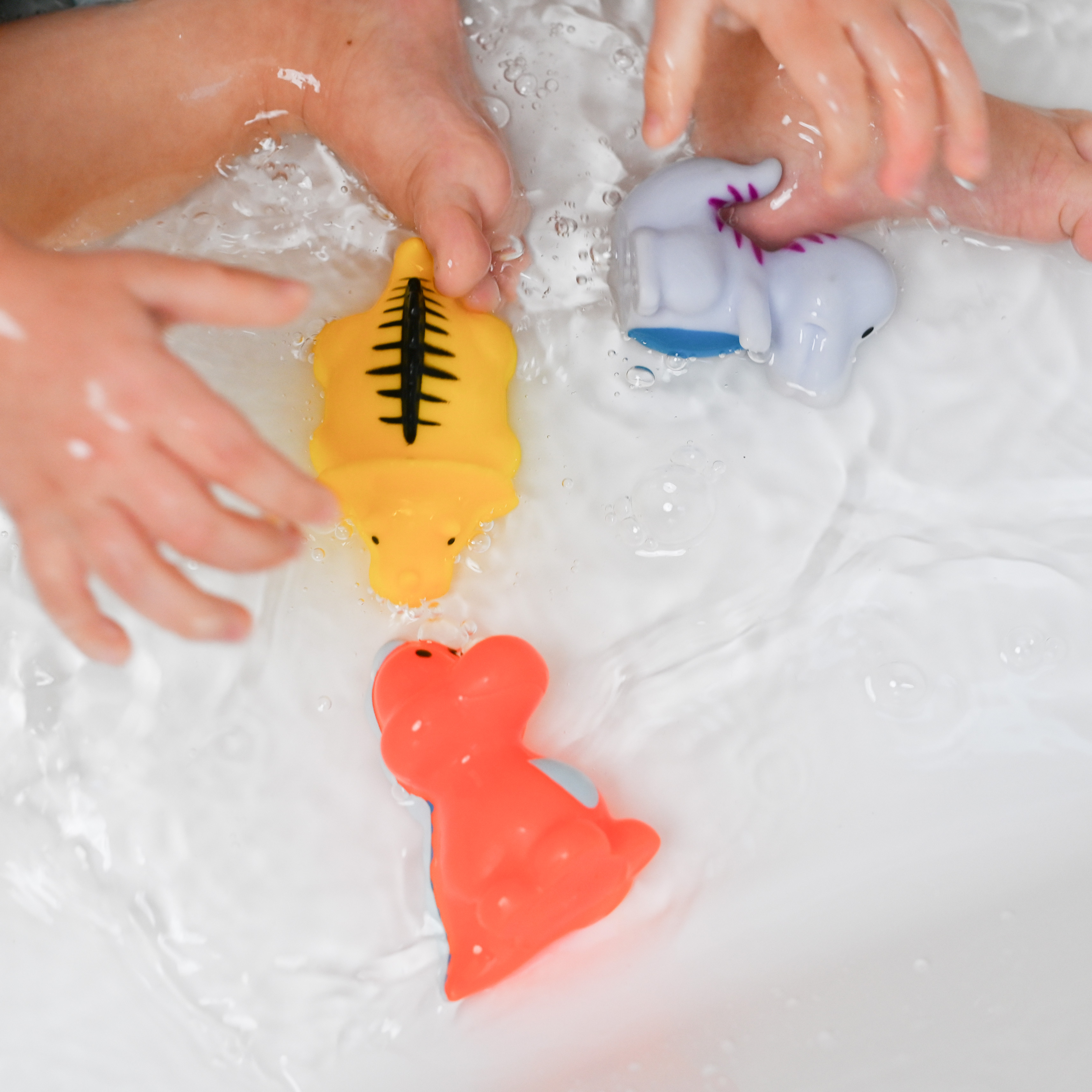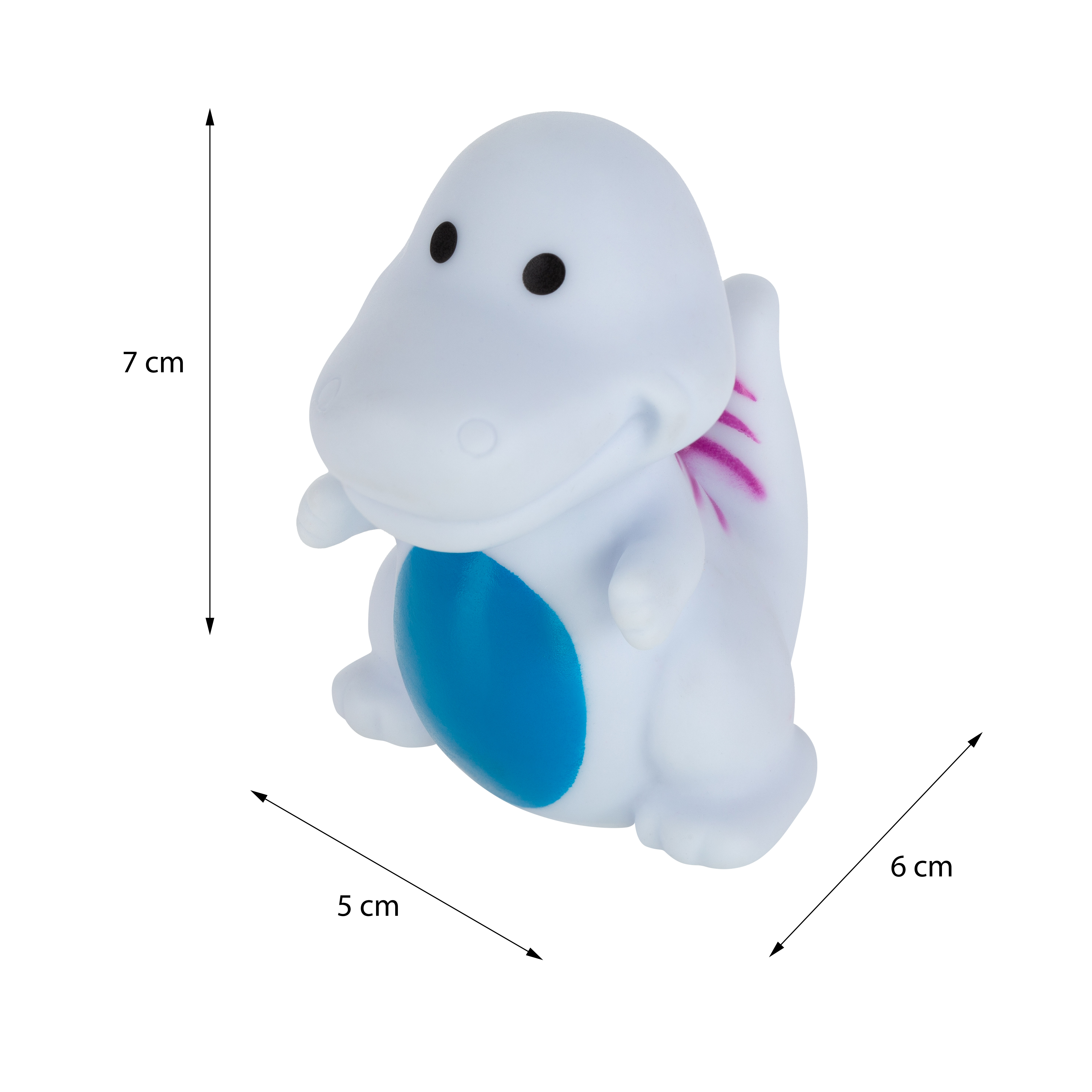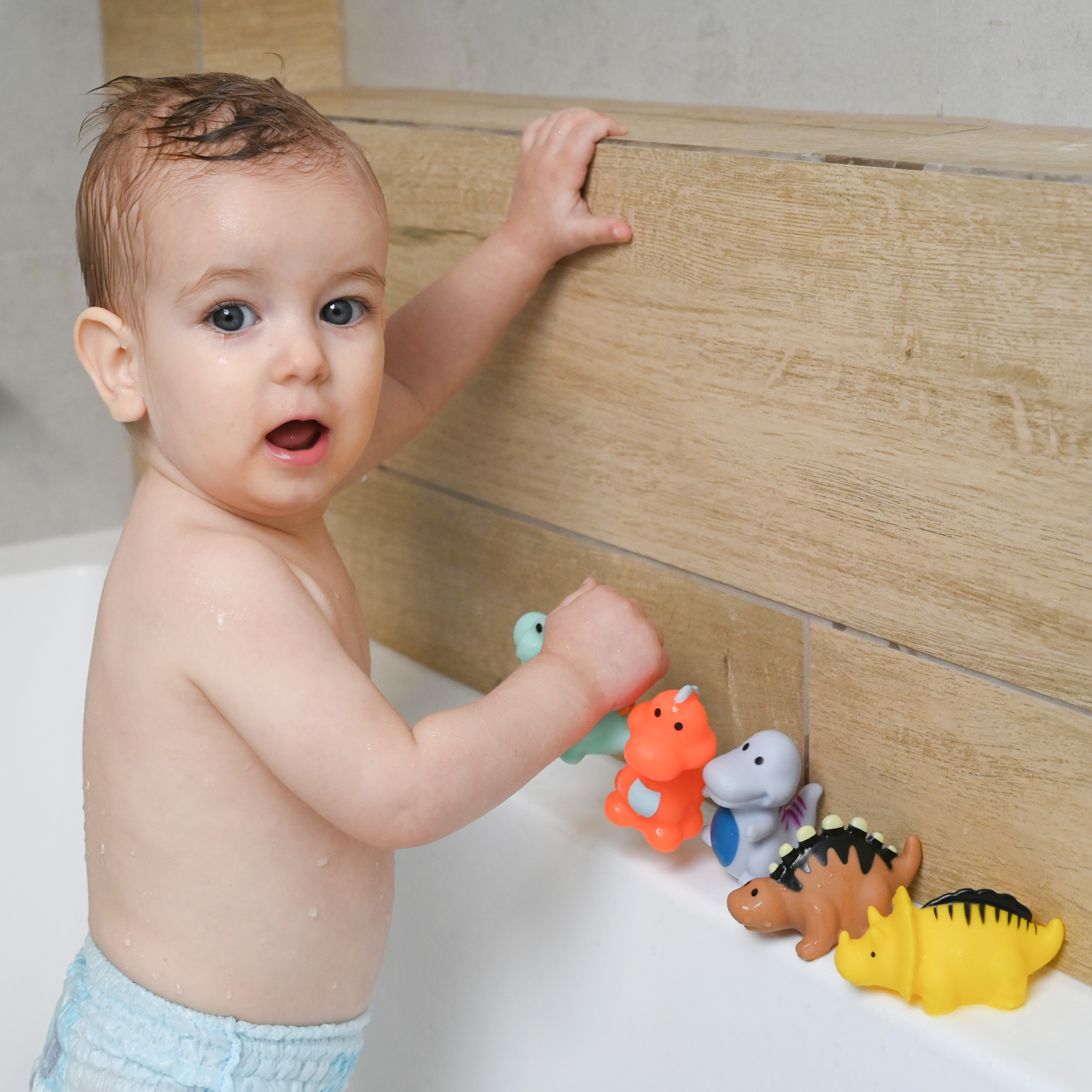 Värikäs kylpylelusetti iloisiin kylpyleikkeihin. Kauniit värit houkuttelevat lasten huomion. Leikin kautta lapsi tutustuu ympäröivään maailmaan. Setissä on 5 erilaista dinosaurusta. Hahmoissa ei ole reikää, joten ne on helppo pitää puhtaina ja hygieenisinä. Pyöristetyt muodot takaavat turvallisuuden leikkiessä. Valmistettu turvallisista, korkealaatuisista materiaaleista, ne eivät sisällä bisfenoli A:ta (0 % BPA). Eläinhahmojen koko on 4-7 cm.