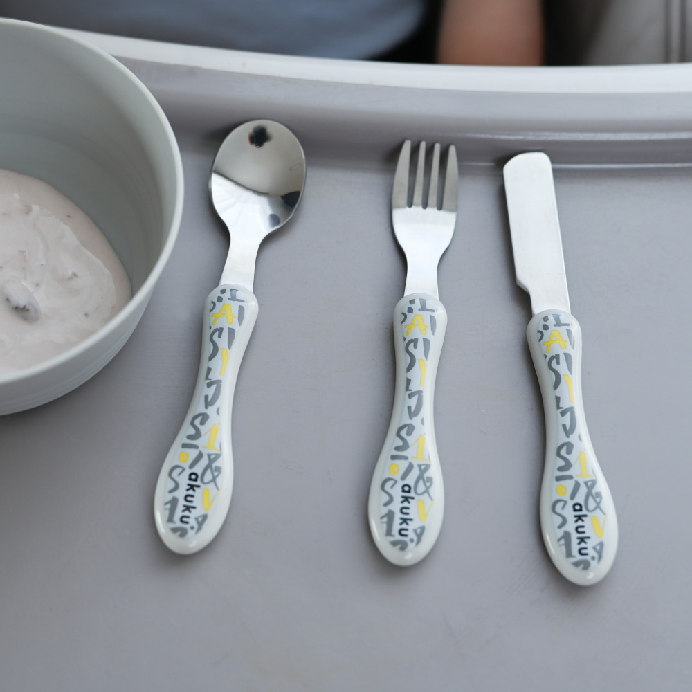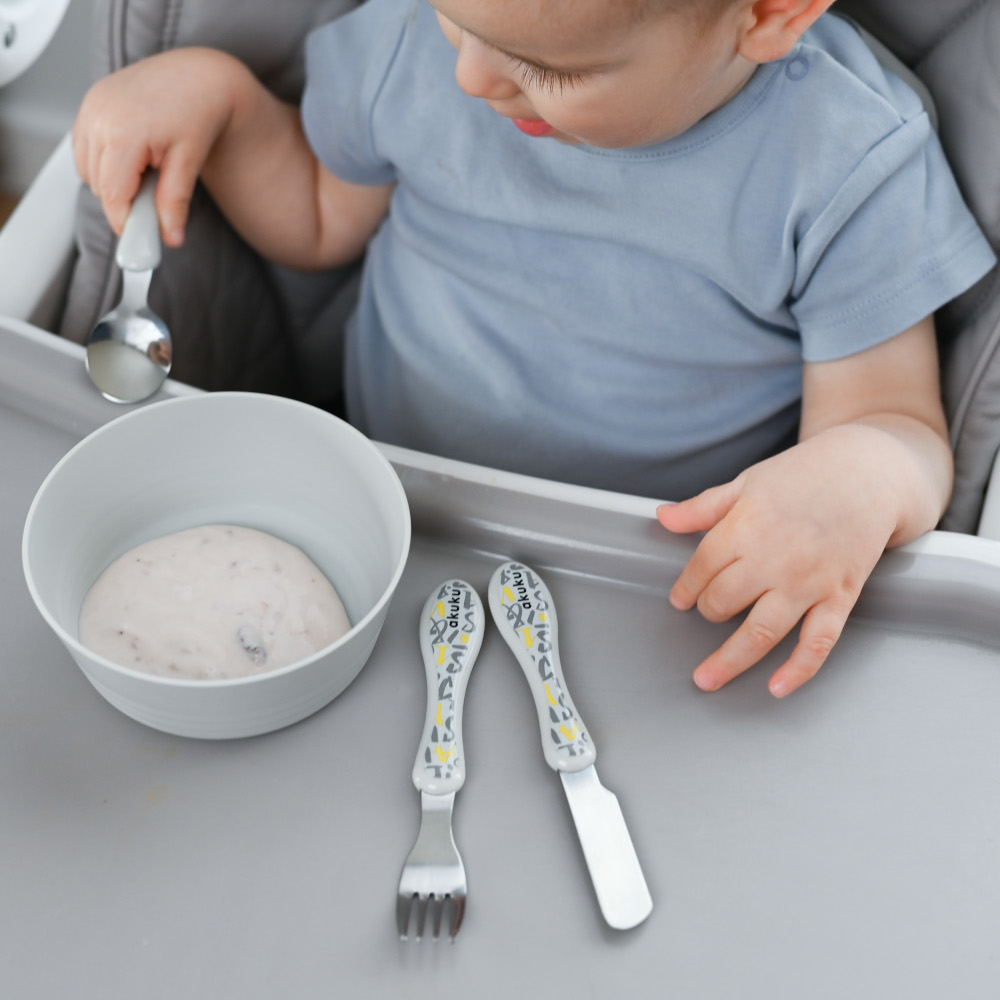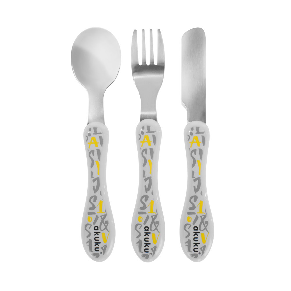 Metalliset ruokailuvälineet, jotka on valmistettu korkealaatuisesta ruostumattomasta teräksestä. Muovipintaiset kahvat. Settiin kuuluu: haarukka, veitsi ja lusikka. Koko on juuri sopiva lapsen pieneen käteen ja suuhun. Erinomainen setti itsenäisen syömisen opetteluun. Suositellaan yli 9 kuukauden ikäisille lapsille