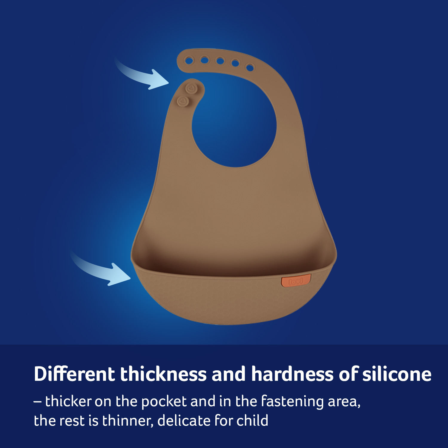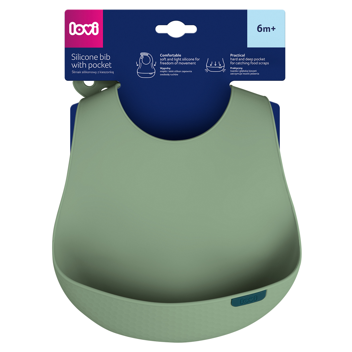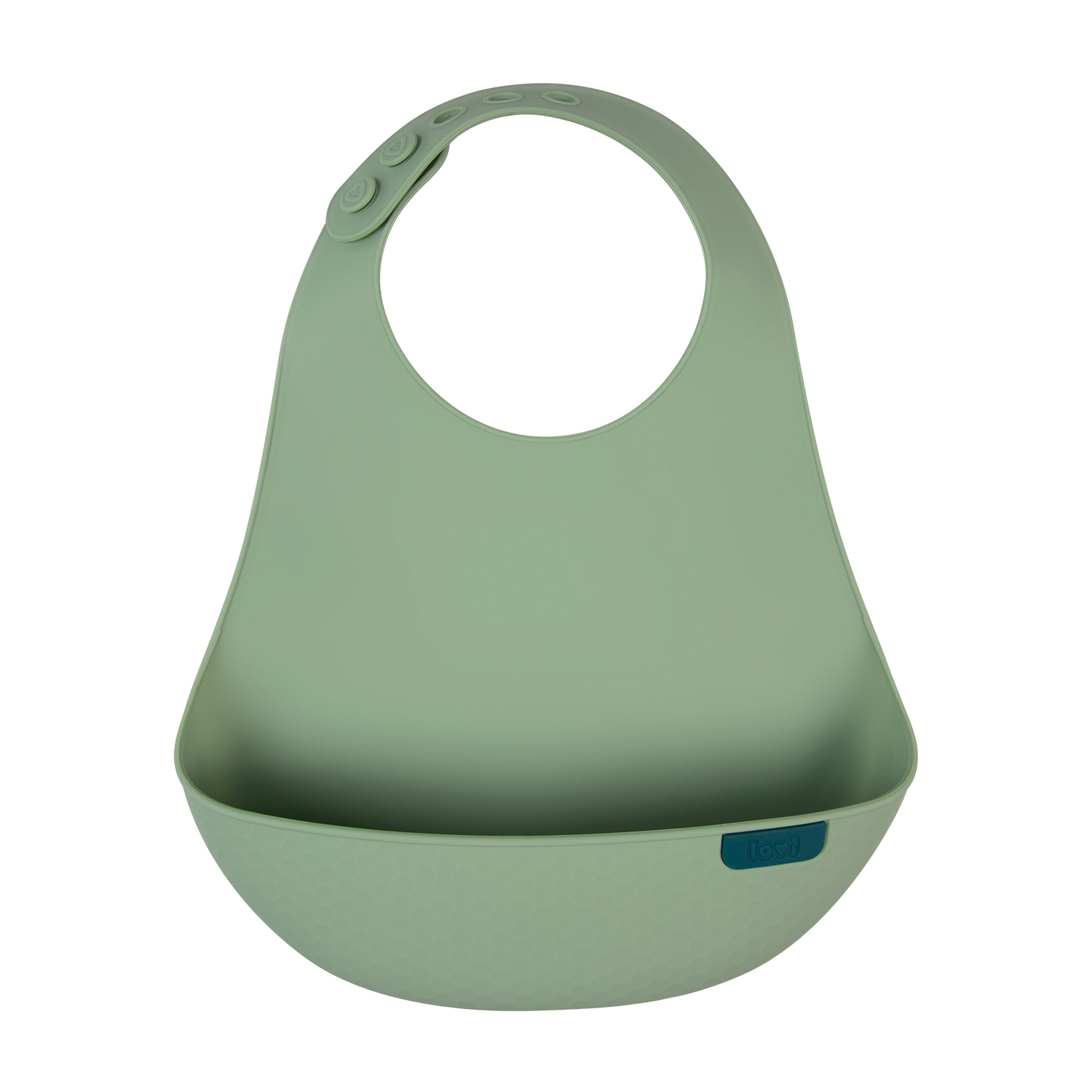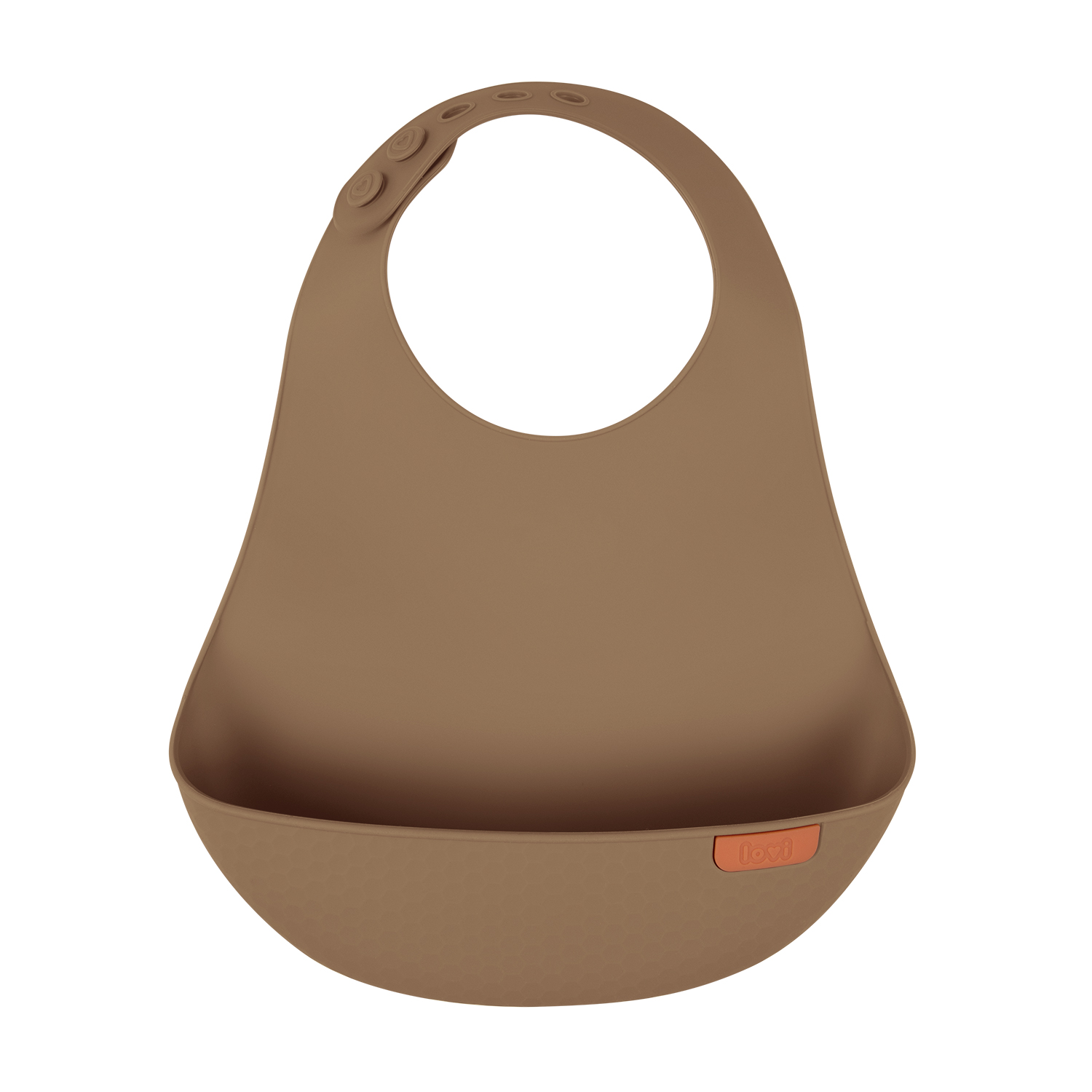 LOVI Silikoninen ruokalappu suojaa sotkuilta, kun lapsi oppii syömään itsenäisesti. Valmistettu kevyestä, pehmeästä ja turvallisesta silikonista. Jämäkkä tasku kerää tippuvat ruoantähteet ja ulottuu leveästi vauvan vatsan sivuille. Säädettävä niskakiinnitys ja ergonominen muotoilu takaavat mukavuuden ja liikkumisen vapauden. LOVI ruokalapulla on kaunis muotoilu ja pintakuviointi. Se on helppo puhdistaa ja voi pestä myös astianpesukoneessa.