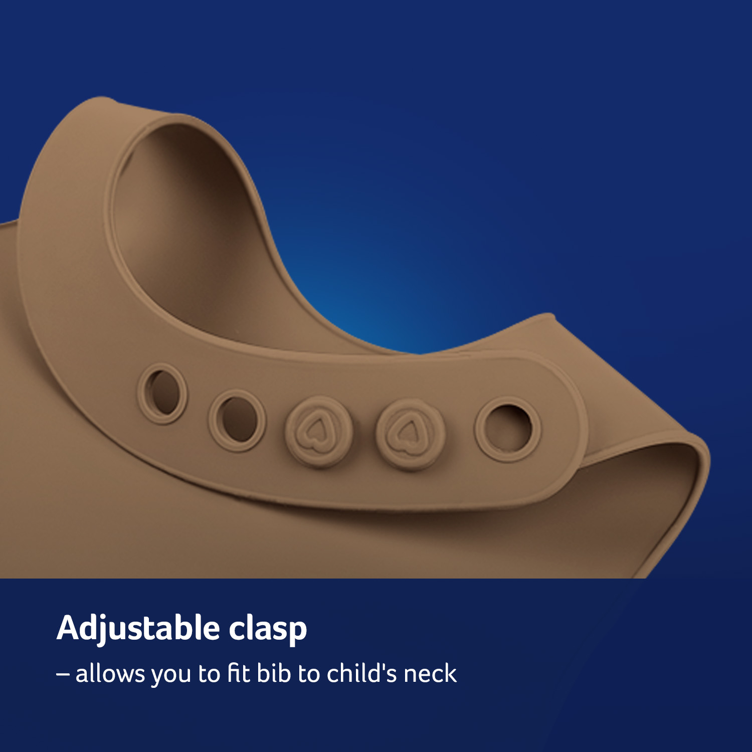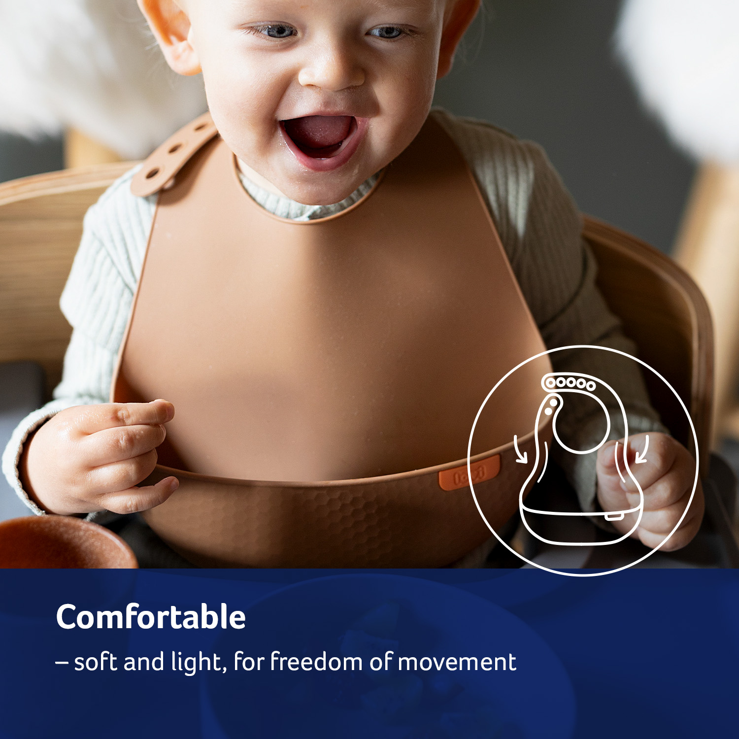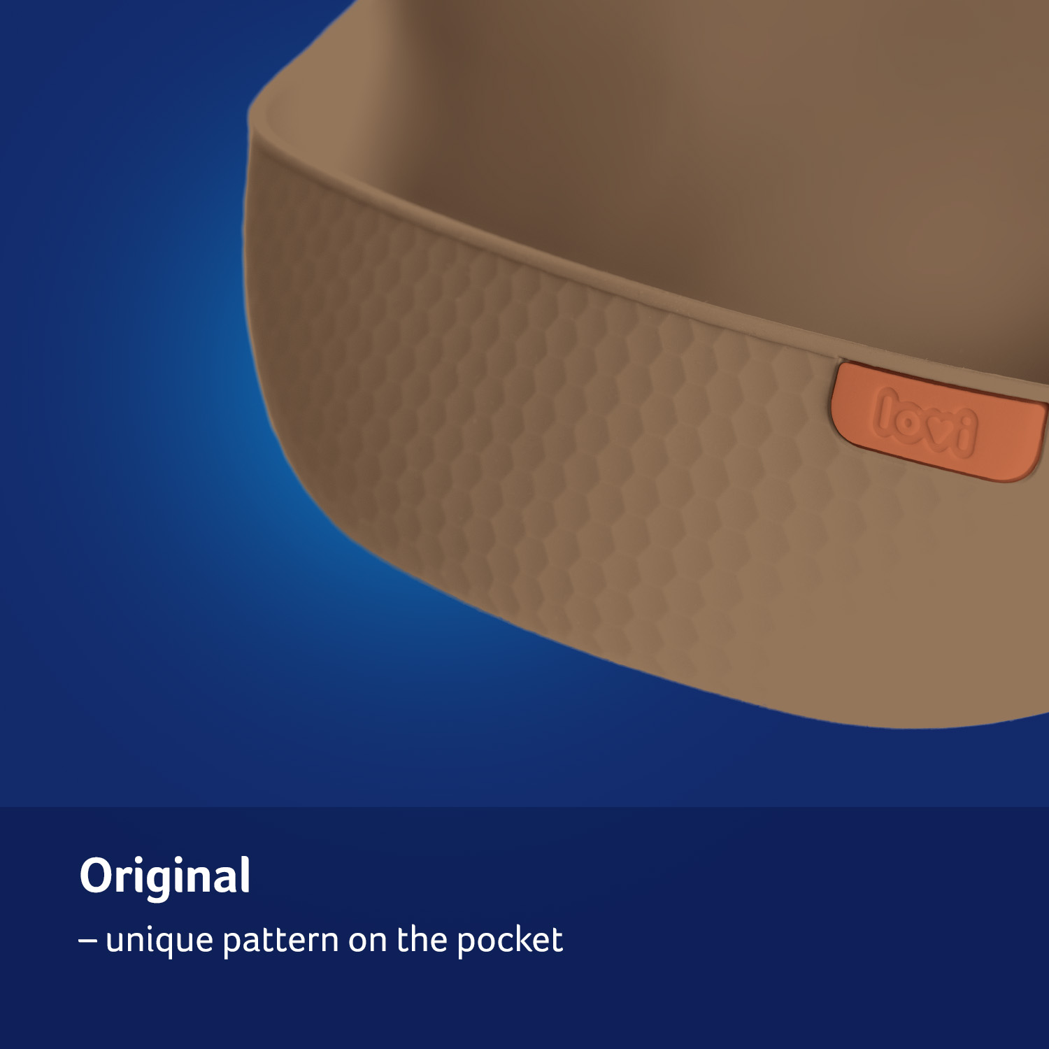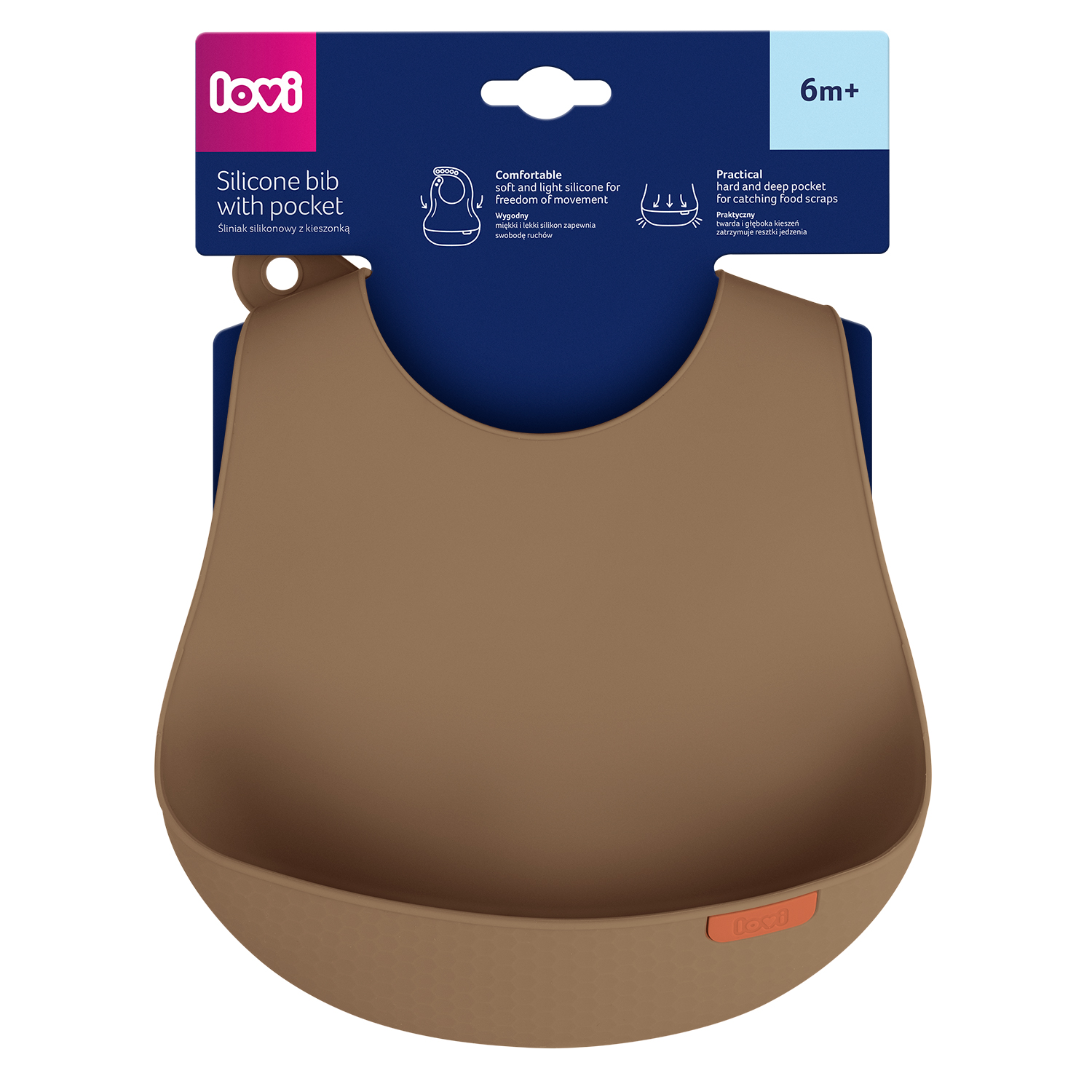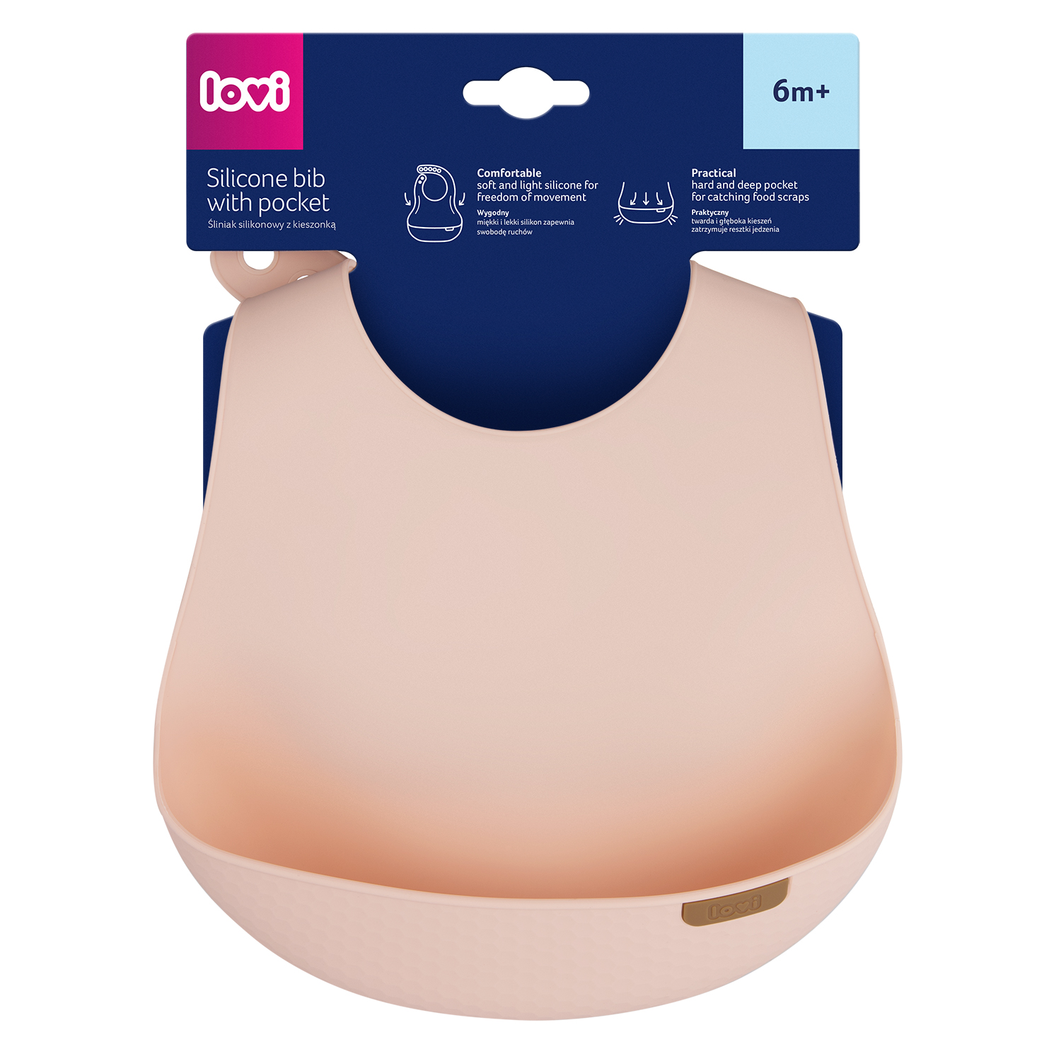 LOVI Silikoninen ruokalappu suojaa sotkuilta, kun lapsi oppii syömään itsenäisesti. Valmistettu kevyestä, pehmeästä ja turvallisesta silikonista. Jämäkkä tasku kerää tippuvat ruoantähteet ja ulottuu leveästi vauvan vatsan sivuille. Säädettävä niskakiinnitys ja ergonominen muotoilu takaavat mukavuuden ja liikkumisen vapauden. LOVI ruokalapulla on kaunis muotoilu ja pintakuviointi. Se on helppo puhdistaa ja voi pestä myös astianpesukoneessa.
