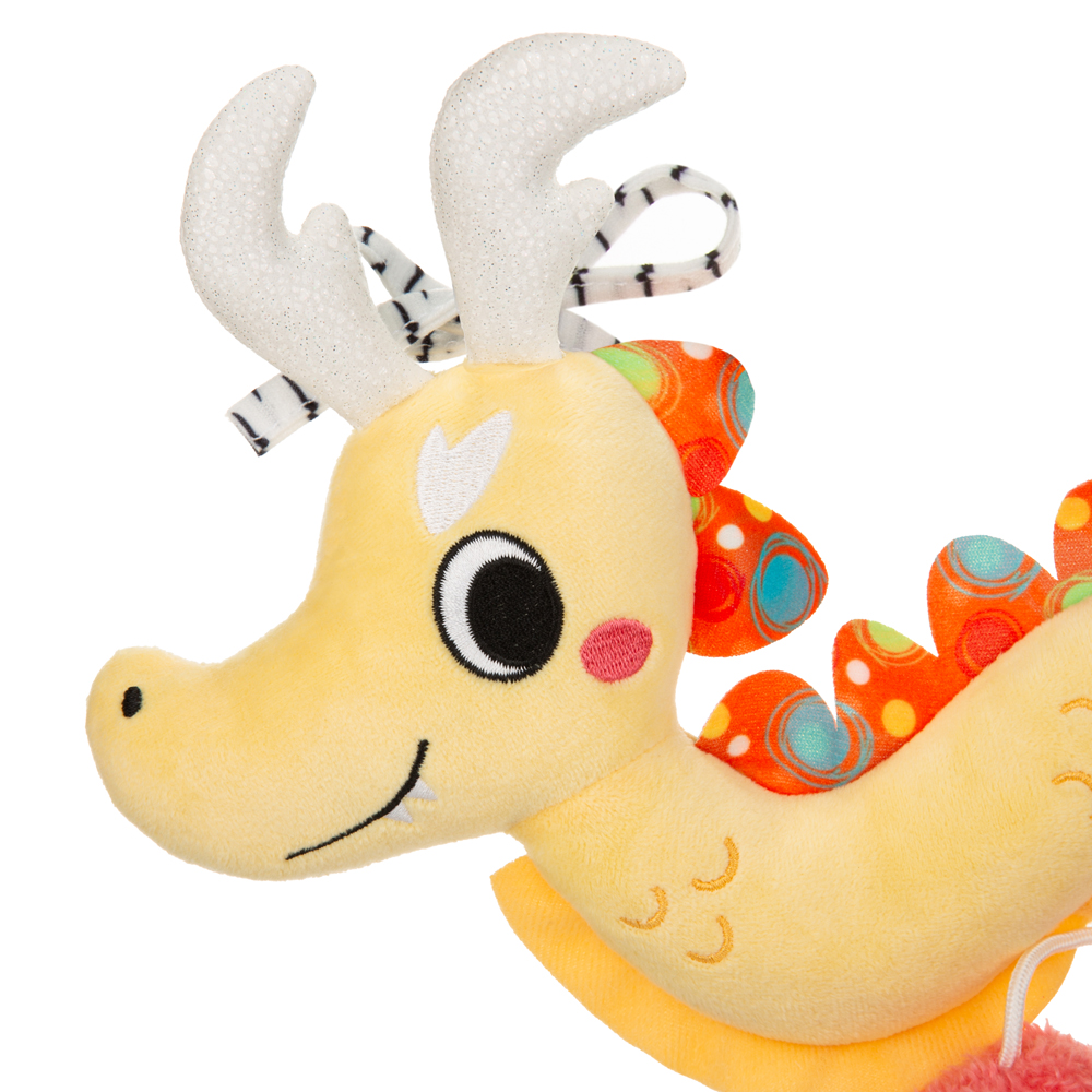 - Värikkäät yksityiskohdat – Lohikäärmeessä on iloisia värejä ja mielenkiintoisia kuvioita, jotka herättävät vauvasi huomion ja tukevat visuaalisen havainnoinnin kehitystä.