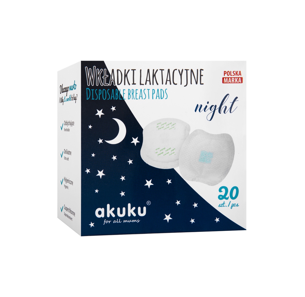 Kertakäyttöiset liivinsuojat "akuku" ovat muotoillut ja mukavat. Suunniteltu erityisesti yökäyttöön: ohut ja erittäin imukyinen materiaali. Pehmeä puuvillavuori ei ärsytä herkkää rintojen ihoa. Vedenpitävä kerros suojaa vuodoilta. Ne on varustettu tarranauhoilla, jotka pitävät tyynyä sopivassa paikassa. Yksittäin pakattu.