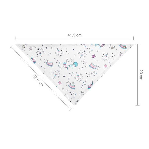 Kolmiohuivi suojaa pikkuisen vaatteita likaantumasta ruokailun yhteydessä, syljen valumisen vuoksi. Lisäksi huivi on kaunis asuste kaulan peittämiseksi. Kolmiohuivissa on säädettävä tarrakiinnitys sopii monenikäiselle lapselle. Tuote on valmistettu kahdesta kerroksesta pehmeää puuvillaa. Hellävarainen lapsesi herkälle iholle. Valmistettu Puolassa. Materiaali: 100 % puuvillaa. Mitat: 37 cm (kaulan ympärysmitta) x 16 cm (pituus kaulasta).