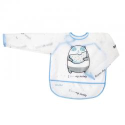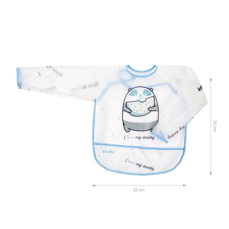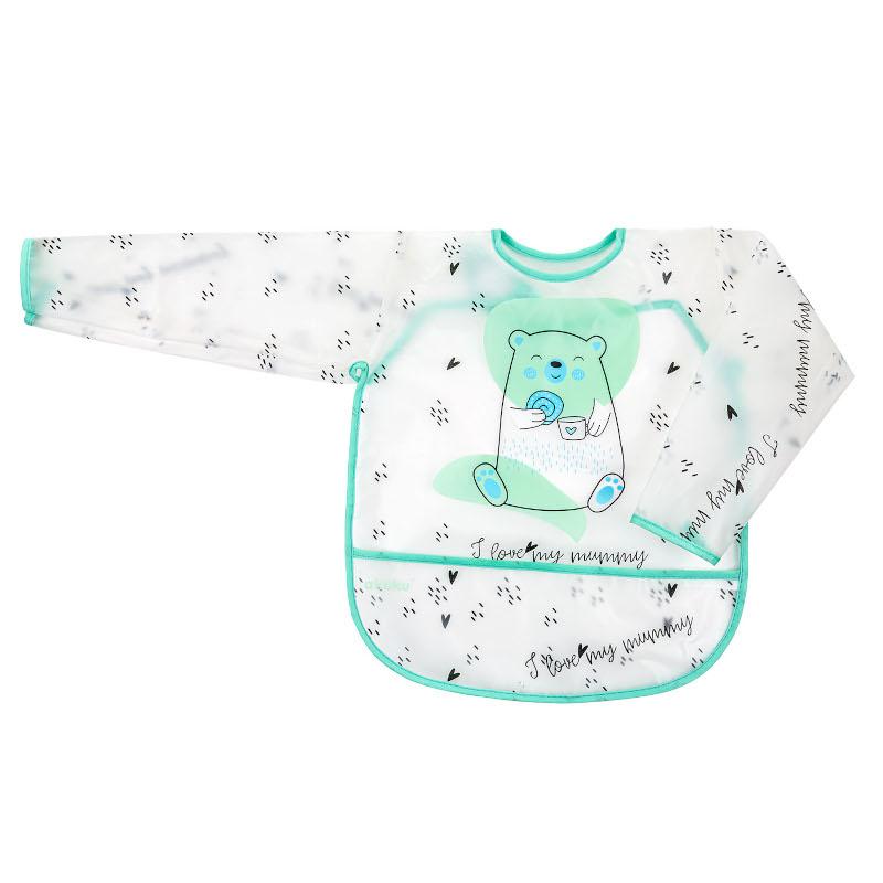 Ihanteellinen essu sormiruokailevien vauvojen ja taaperoiden ruokailuun. Valmistettu pehmeästä, vedenpitävästä ja turvallisesta kankaasta. Hihansuissa kuminauha, joka estää ruoan putoamisen niiden sisään.
