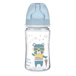 Kirkas tuttipullo, joka on valmistettu parhaan laatuluokan polypropyleenistä. Se on kestävä, turvallinen ja täyttää korkeimmat laatustandardit. Pullotutin uusi venttiilityyppi mahdollistaa tehokkaan ilmankierron ja vähentää koliikin riskiä.