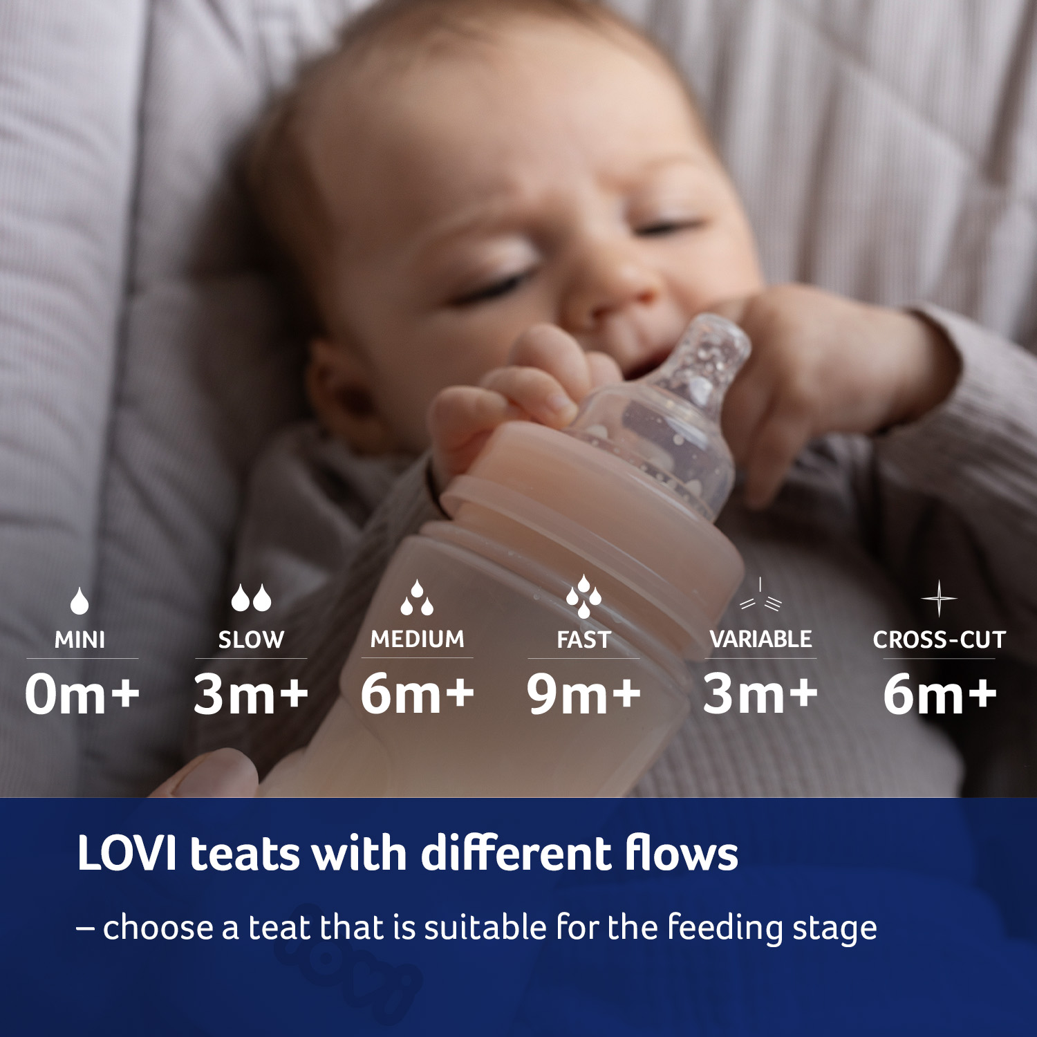 Lovi dynamista pullotuttia® on saatavana kuutena eri versiona vauvan eri kehitysvaiheisiin, 2 kpl/pkt