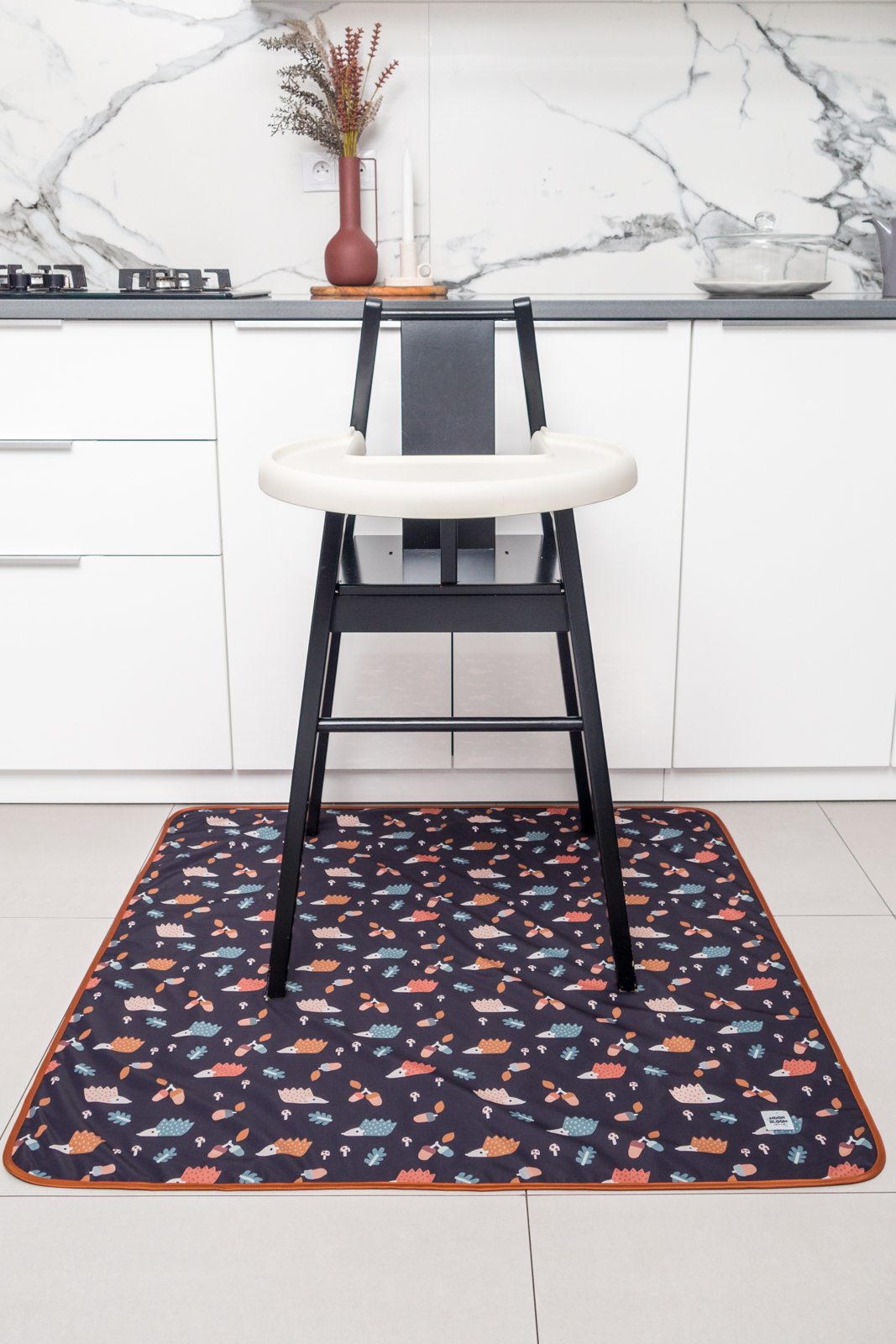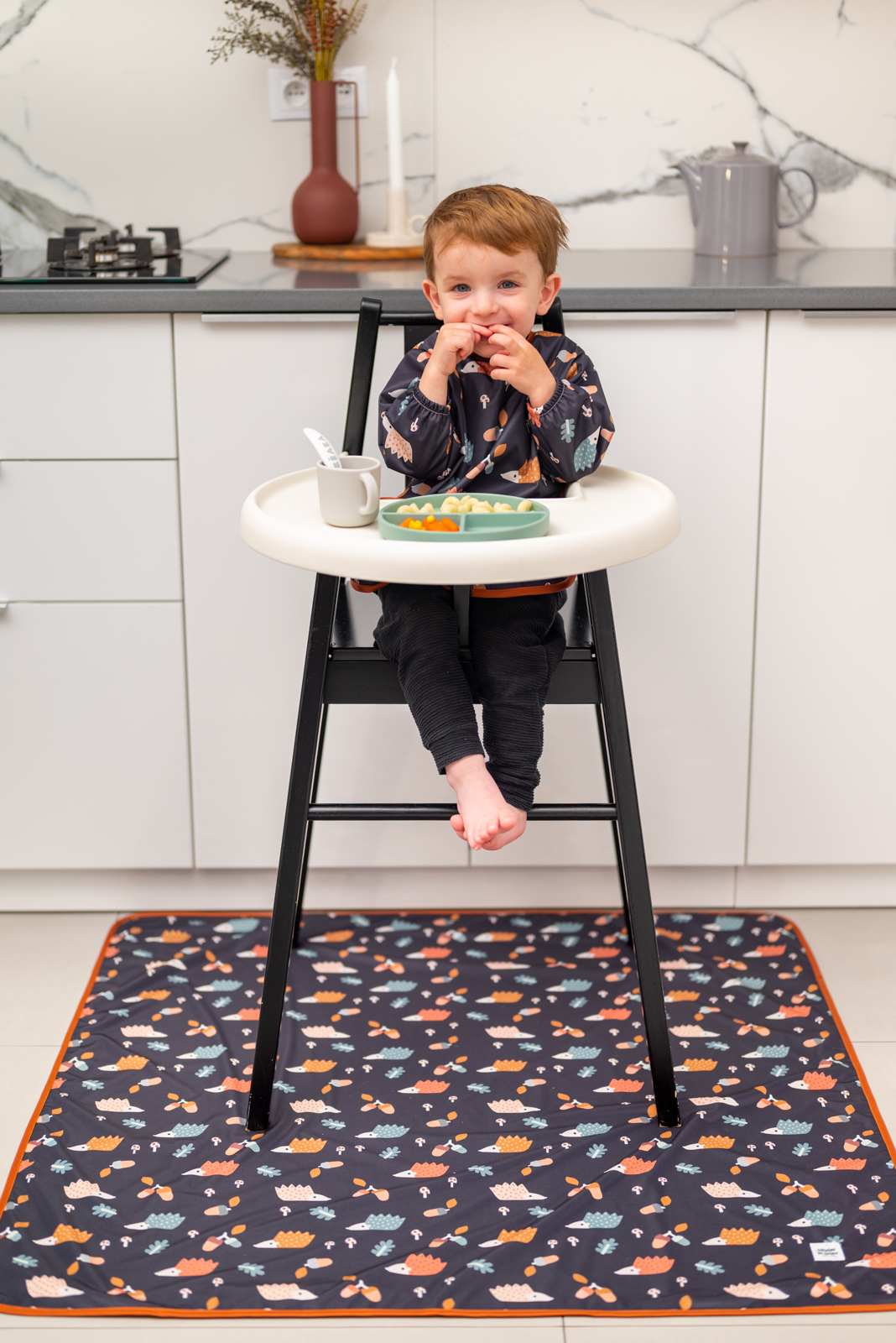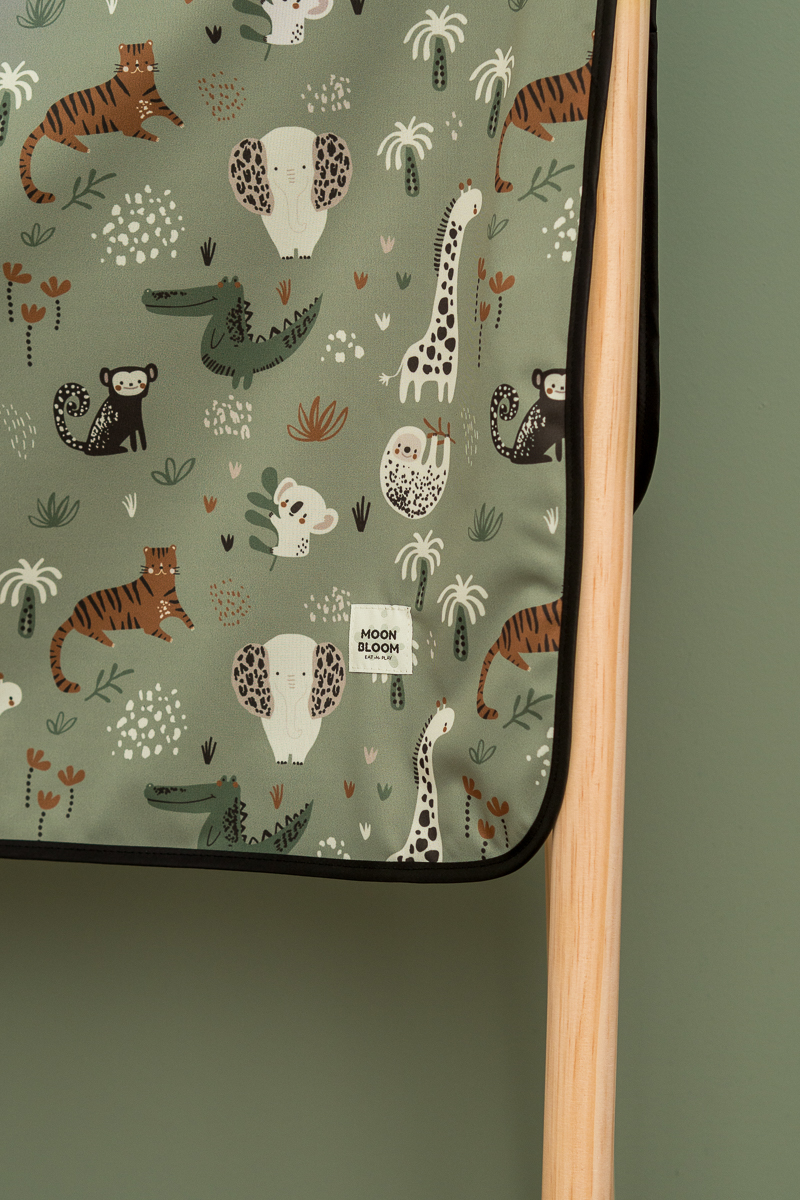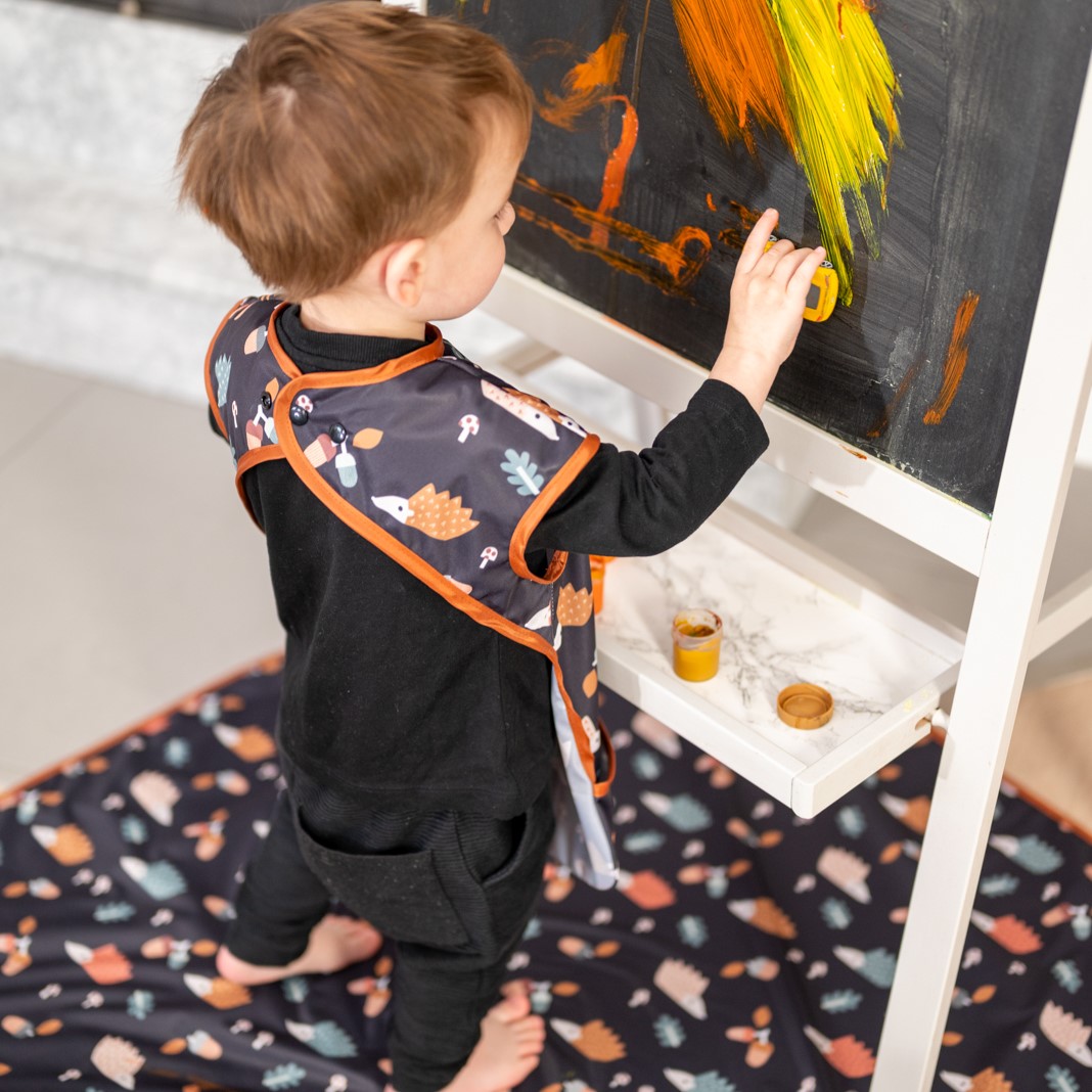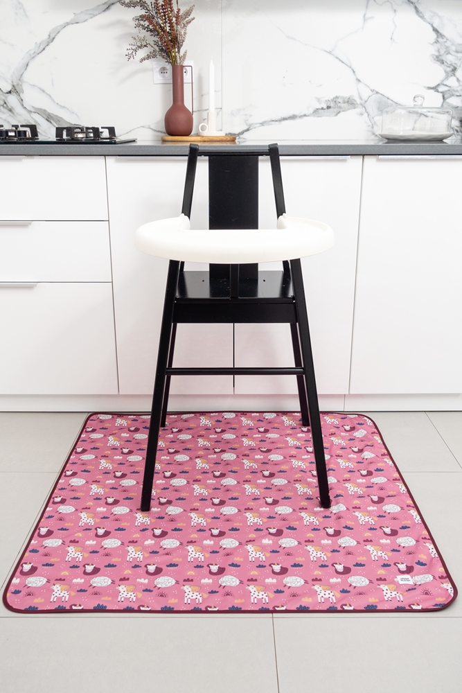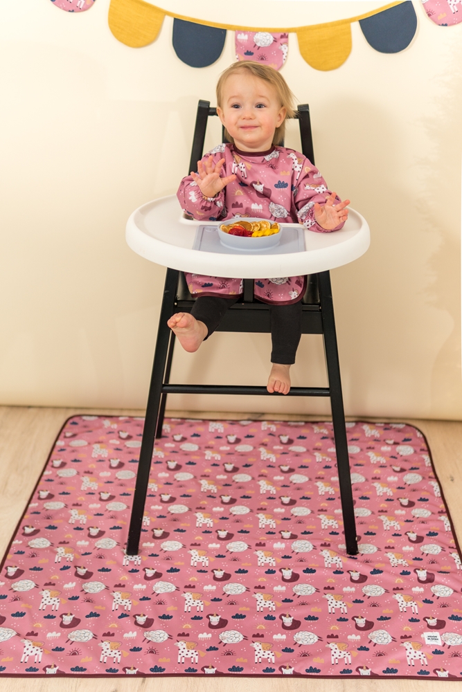 Mitat: 100cm x 100cm. Taitettavissa pieneen kokoon.Materiaali: TPU-kalvolla varustettu 100% polyesteri. Valmistettu Puolassa.Hoito:Ravista mahdolliset ruokajäämät pois ja pyyhi jokaisen käyttökerran jälkeen. Pesu enintään 40 °C:n lämpötilassa. Älä kuivaa rumpukuivaa. Älä silitä. Tuotetta tulee käyttää aikuisen valvonnassa.