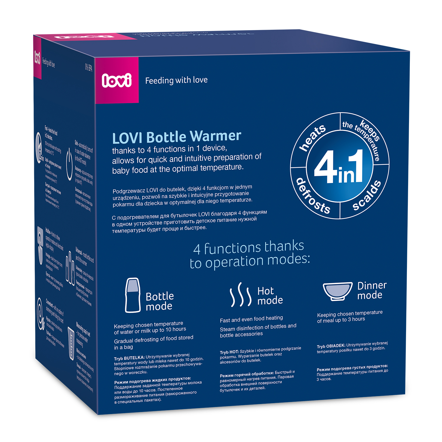 Lovi pullonlämmitin on nopea ja intuitiivinen. Voit tarjota juuri sopivan lämpöistä ruokaa lapsellesi vain muutamassa minuutissa. Laite kuumentaa ruoan nopeasti ja tasaisesti riippumatta siitä, onko lämmitettävä ruoka jääkaappiviileää tai huoneenlämpöistä. Lämpötilan ylläpitotoiminnon avulla voit tarjota ruokaa sopivaan aikaan. Lämmitin helpottaa myös ruoan sulatusta sekä tuttipullojen ja pienien syöttöastioiden sterilointia.