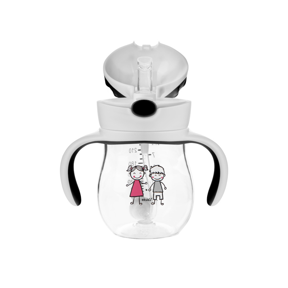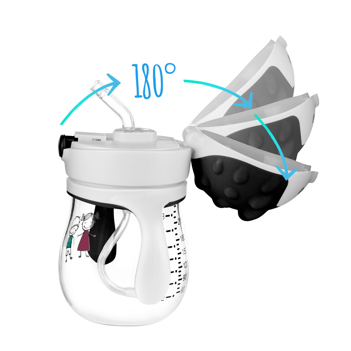 Tiivis kansimekanismi estää juoman vuotamisen ja suojaa pilliä lialta. Avautuu kätevästi painamalla painiketta. Läpinäkyvyys ja mukiin merkitty mitta-asteikko mahdollistavat nestemäärän tarkan annostelun. Voidaan pestä (ilman pilliä) astianpesukoneessa ylätasolla. Älä lämmitä mikroaaltouunissa. Tilavuus 250 ml.