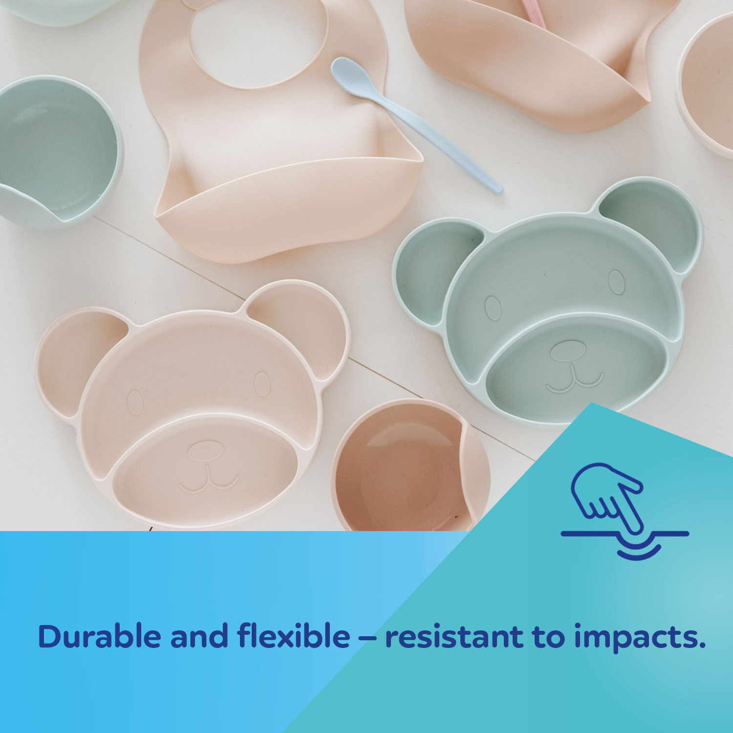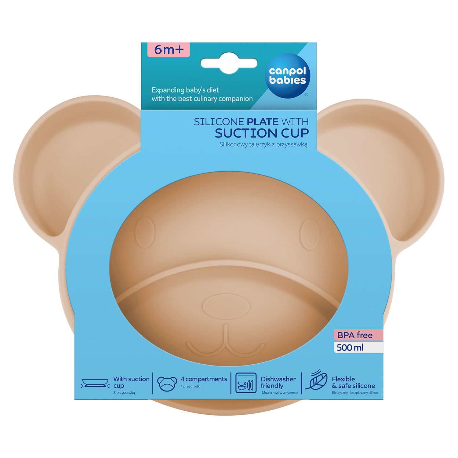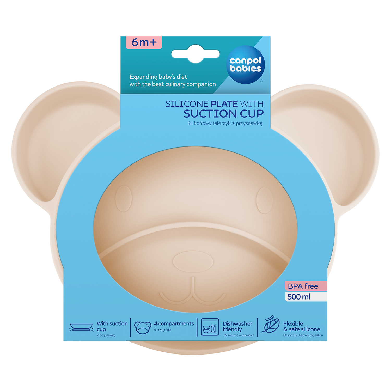 Imukupillinen silikonilautanen lokeroilla toimii niin itsenäisen ruokailun harjoittelussa kuin vanhemman avustamana. Imukupin ansiosta astia kiinnittyy turvallisesti pintaan ja ehkäisee sitä putoamasta pois pöydältä tai syöttötuolin tasolta. Käytännöllisen muotoinen lautanen voidaan pestä turvallisesti astianpesukoneessa ja lämmittää mikroaaltouunissa. Lautasen neljä erillistä lokeroa sopii hyvin sormiruokailuun ja auttaa uusiin ruokalajeihin tutustuessa. Saatavana kahtena väriversiona. Tilavuus 500 ml.