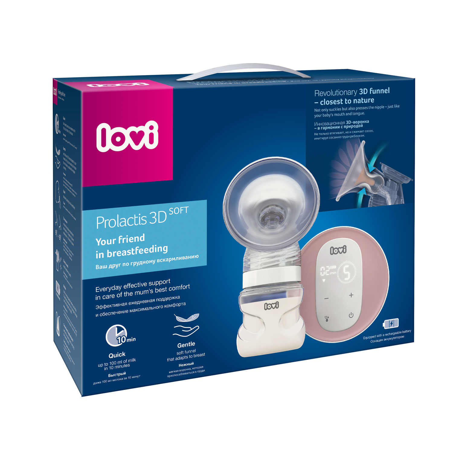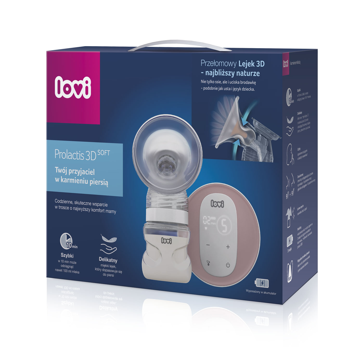 LOVI Prolactis 3D Softissa on vallankumouksellinen 3D-suppilo, joka on lähinnä luontoa.Toisin kuin klassisissa järjestelmissä, ei vain imee, vaan myös painaa nänniä. 3D-suppilo ympäröi ja painaa tasaisesti nänniä ja toimii useissa suunnissa samaan aikaan, aivan kuten vauvan suu ja kieli tekevät. Tasainen ja lempeä paine stimuloi prolaktiinia, maidontuotannosta vastaavan hormonia. Tämä lisää eritystä, jolloin maito valuu ulos nopeasti ja luonnollisesti ilman epämukavuutta.